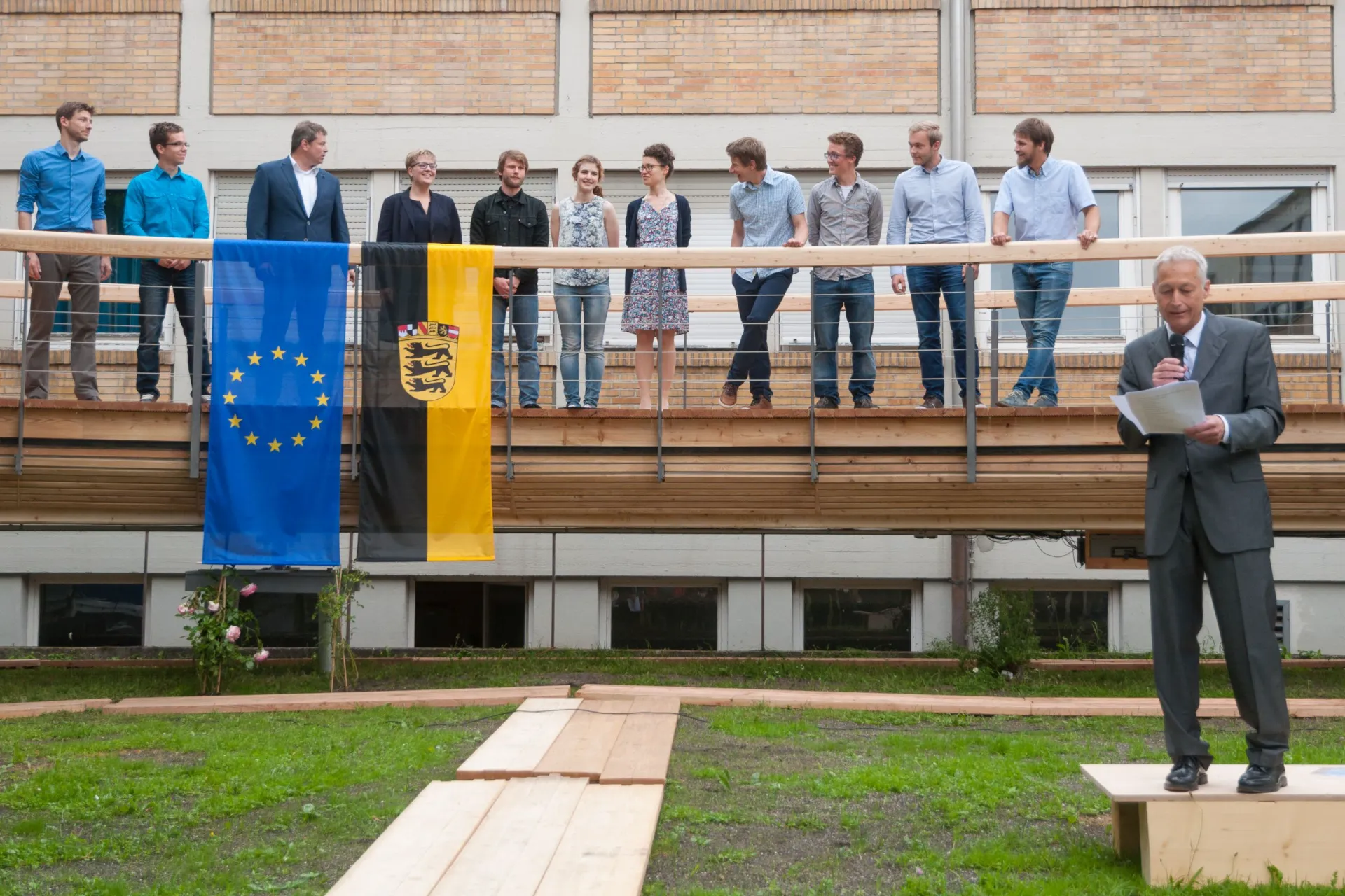 Das mit der Fundamentierung insgesamt 40 Meter weit spannende Pilotprojekt ist auf dem Campus der Universität Stuttgart in Vaihingen zu besichtigen. Die Brücke ist mit Sensoren ausgestattet, die permanent Messungen durchführen und daraus wichtige Erkenntnisse für die Robustheit, Wartung und Langlebigkeit von Holzbrücken im Freiland liefern. Die reine Holzkonstruktion der Brücke spannt 25 Meter und ist mit Fahrzeugen befahrbar. Wesentliche Elemente der Konstruktion sind ein integraler, fugenloser Widerlageranschluss zum Fundament, ein entzerrter Übergang sowie einfach rückbaubare Schraubpfahlfundamente. Die Brückenbelagslösungen schließen eine zweite Abdichtungsebene ein und garantieren eine dauerhafte, robuste Holzbrücke als Verkehrsbauwerk. Die „Stuttgarter Holzbrücke“ soll künftig nicht nur als Fußgänger- und Radwegebrücke, sondern auch als hoch belastbares Verkehrsbauwerk für PKW und LKW gebaut werden.